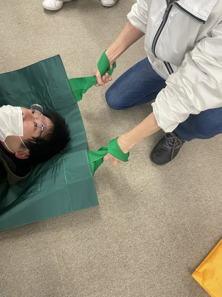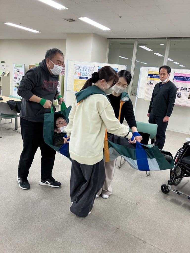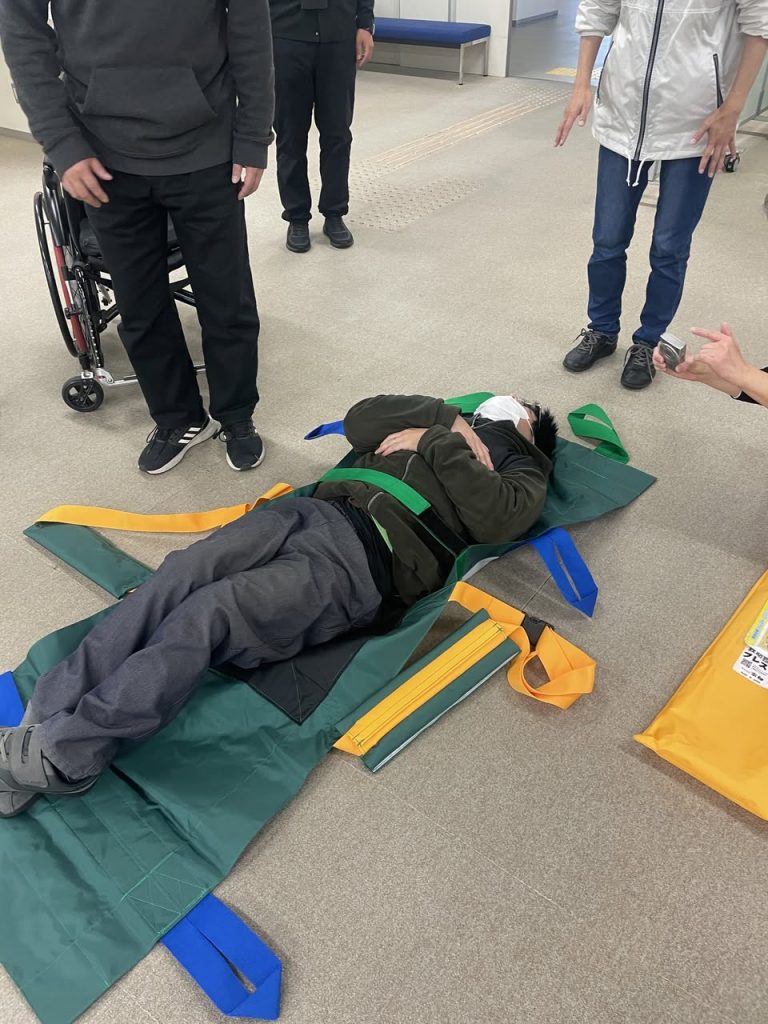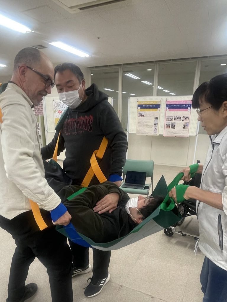 協働センタースタッフに加え、同じフロアにいらっしゃる東部外国人相談窓内のスタッフ、児童デイサービスつくしんぼのスタッフの方に参加していただき、実際に車椅子を利用しているスタッフを担架を使って移動しました。