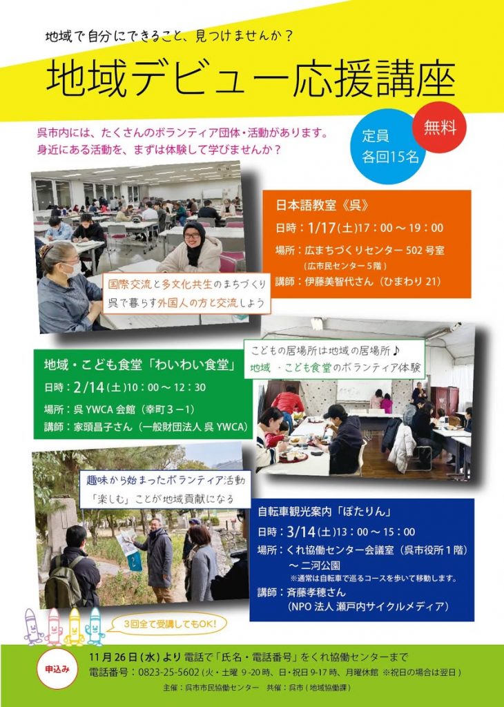 主催:呉市市民協働センター共催:呉市地域協働課・・・2月、3月の講座もあります。3回全て受講しても、1回でもOK!内容は各回、講師による団体の活動紹介と活動体験です。