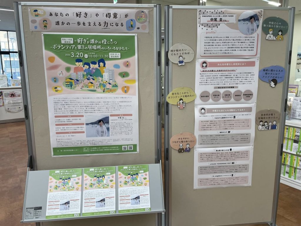 くれ協働センター、ひろ協働センターともに中尾さんの多様な活動を展示で紹介しています。お立ち寄りの際にご覧ください。