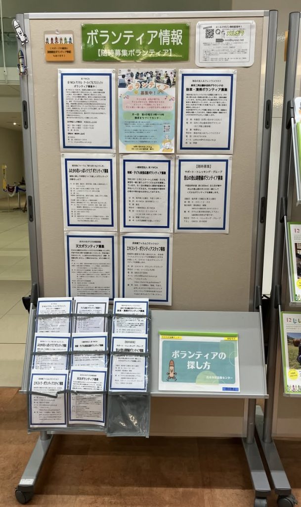 呉市市民協働センターでは、毎月、ボランティア募集情報やセンターからのお知らせをメールマガジン「メルボラ」で配信しており、情報は各センターでの掲示物でもお知らせしています。