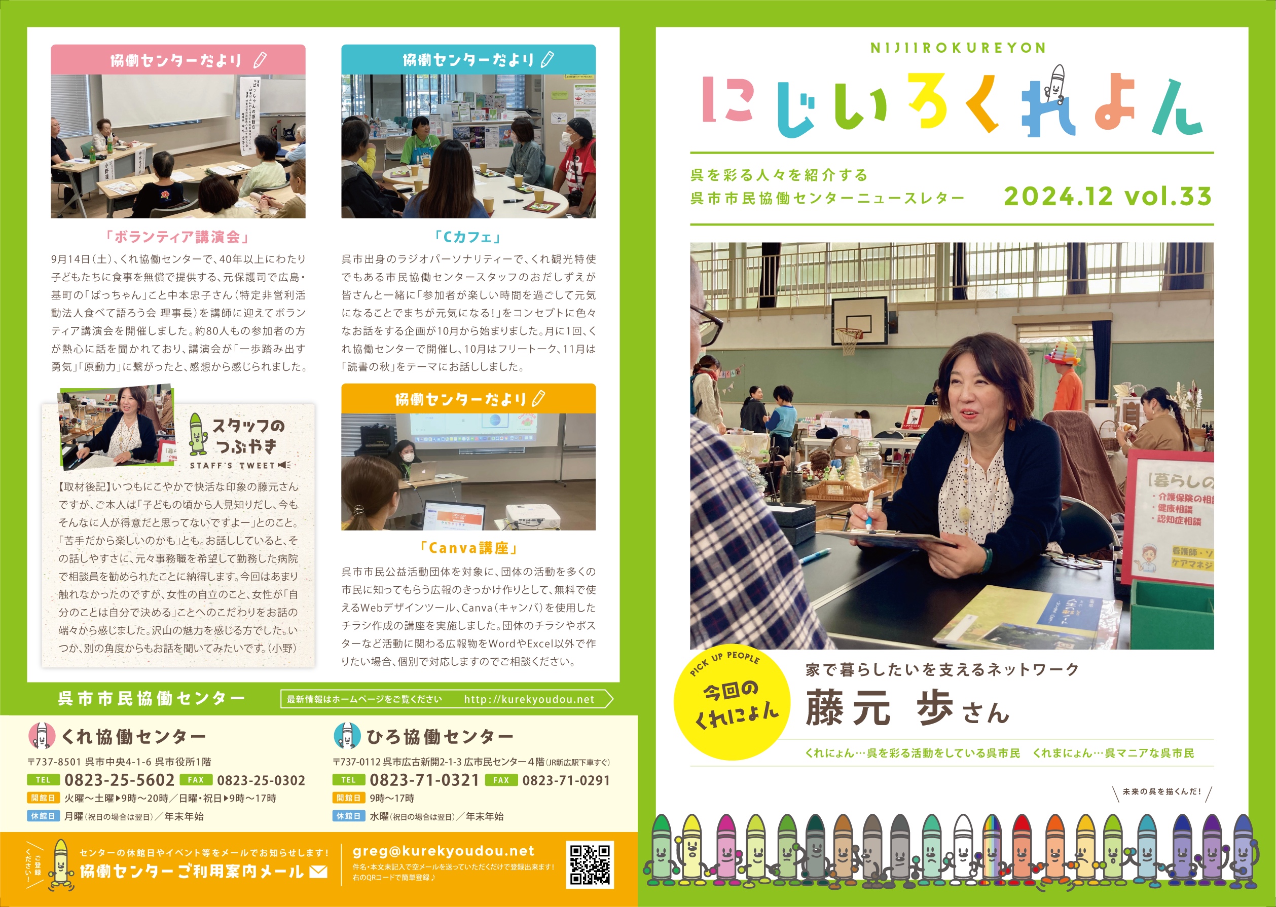 (33)家で暮らしたいを支えるネットワーク 藤元歩さん くれ&ひろ協働センターだより 本文はこちら