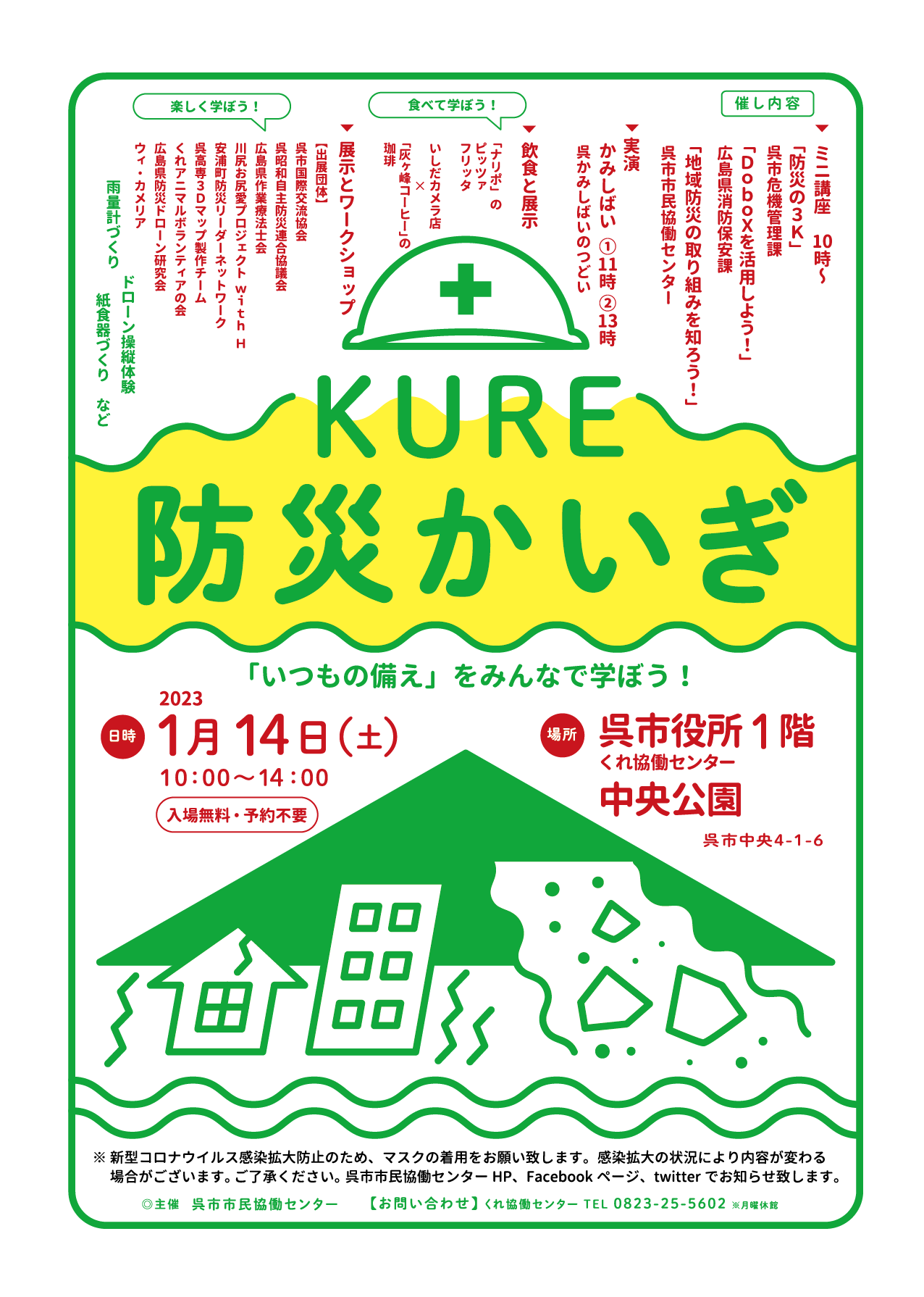 楽しみながら、地域防災について学び合う防災イベント「KURE防災かいぎ」を開催します。