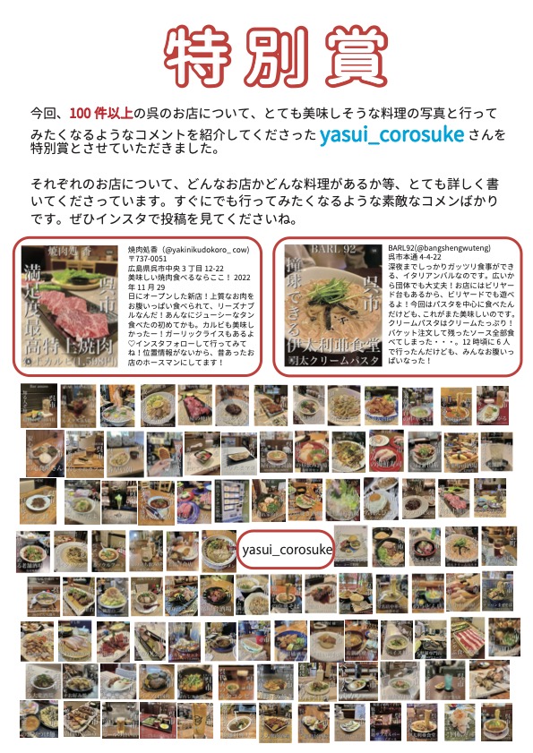 また今回は、100件以上の呉のお店についてとても美味しそうな料理の写真と、行ってみたくなるような詳しいコメントを紹介してくださったyasui_corosukeさんを特別賞とさせていただきました。
