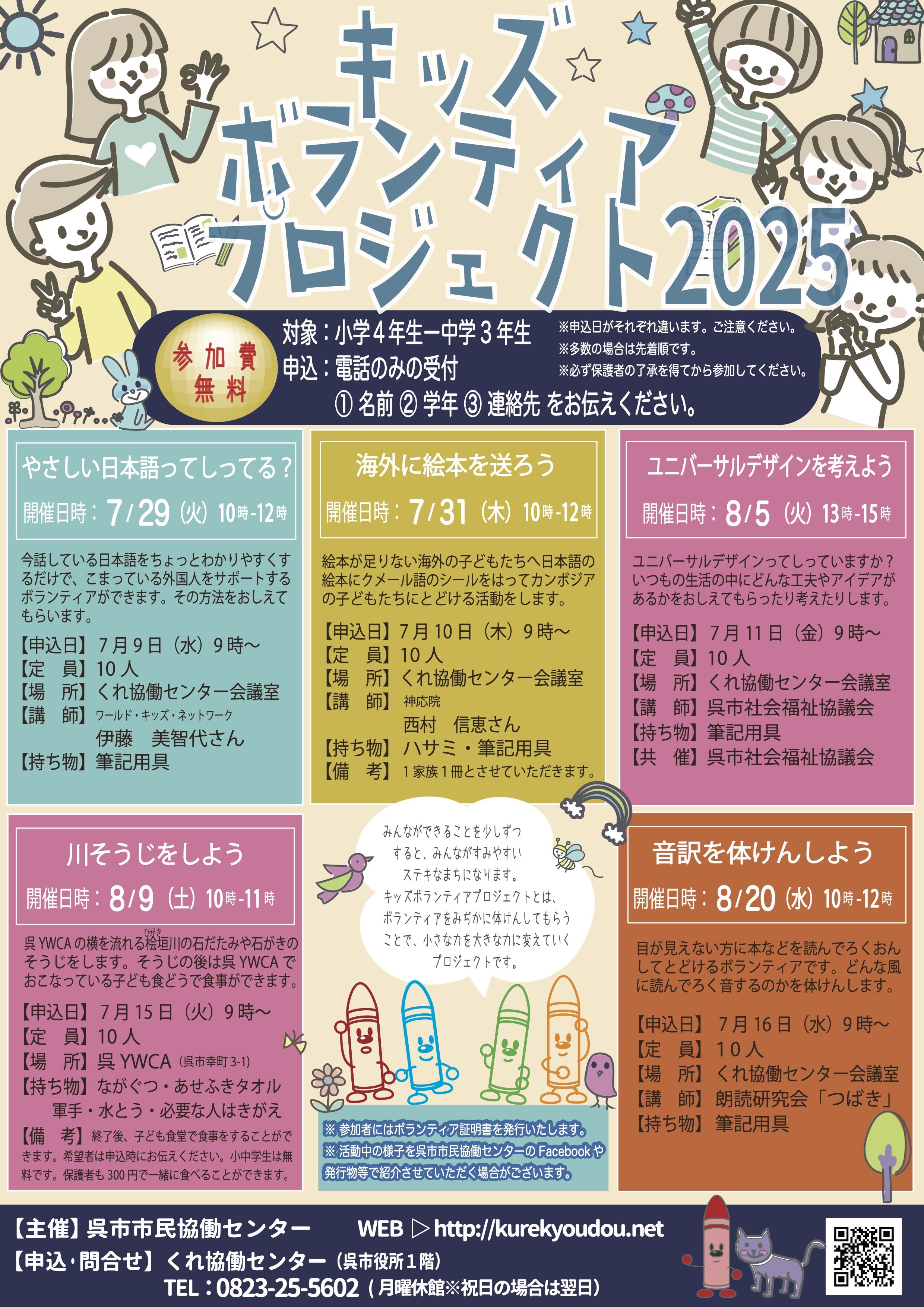 小・中学生のみなさんにボランティアを身近に体験してもらうことで自分でもできることがあることに気づき、みんなができることを少しずつすることで小さな力を大きな力に変えていき、呉市を素敵なまちにしていきましょう。