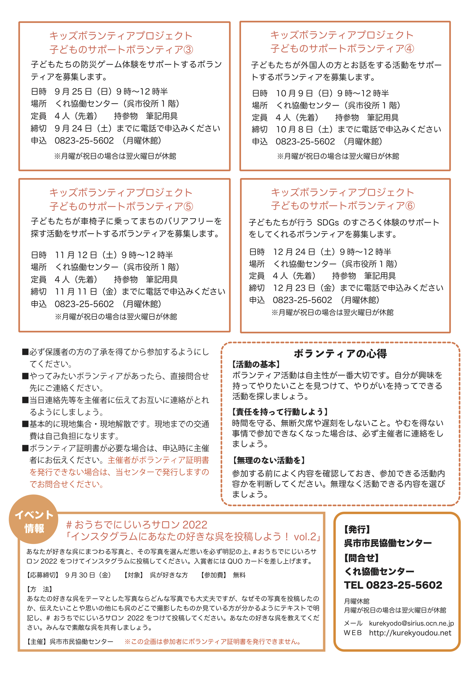 呉市市民協働センターでは、高校生が参加しやすいボランティアの情報を提供しています。ぜひこの機会にボランティアを始めてみませんか?