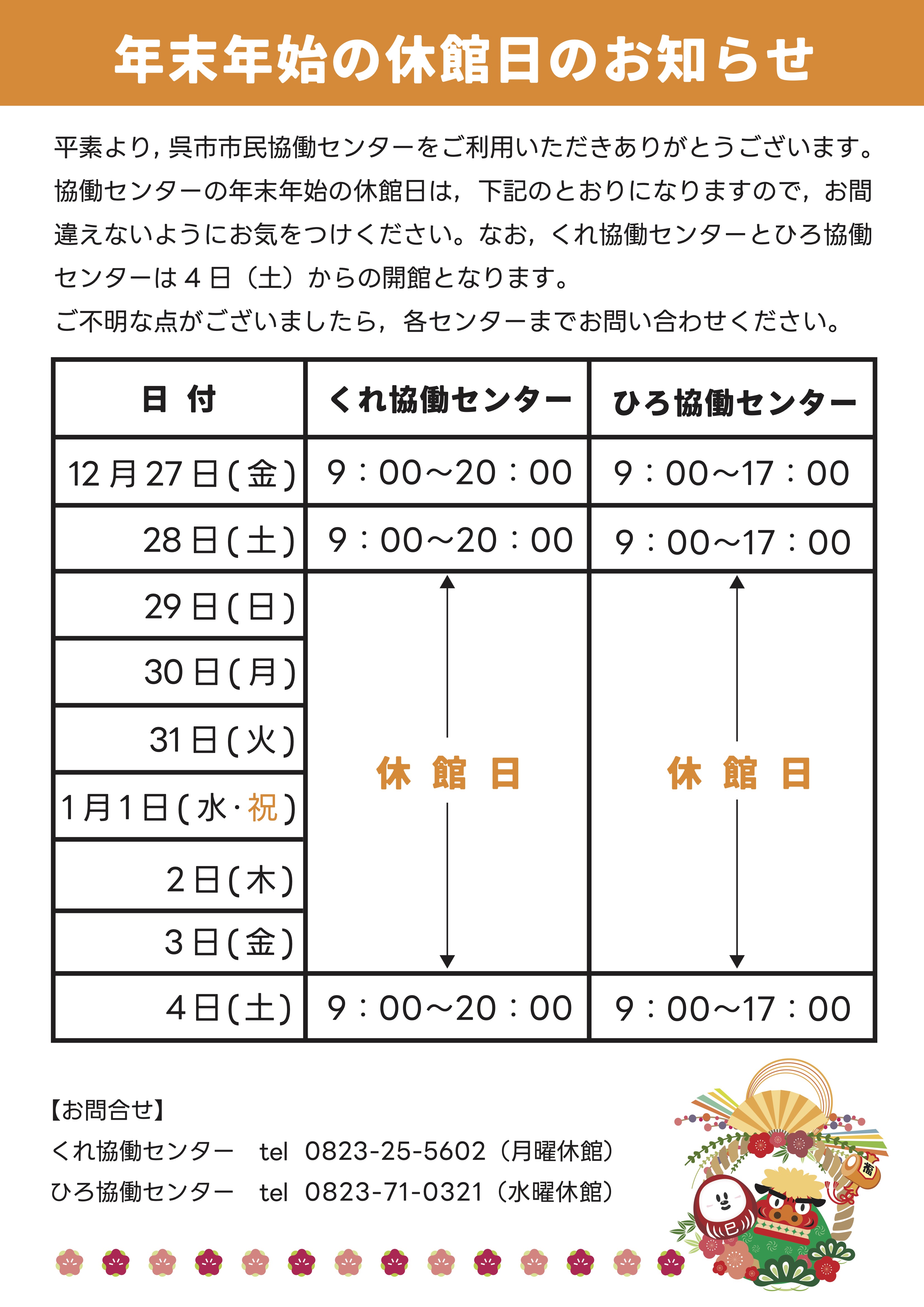 平素より,呉市市民協働センターをご利用いただきありがとうございます。協働センターの年末年始の休館日は,下記のとおりになりますので,お間違えないようにお気をつけください。なお,くれ協働センターとひろ協働センターは 4 日(土)からの開館となります。ご不明な点がございましたら,各センターまでお問い合わせください。
