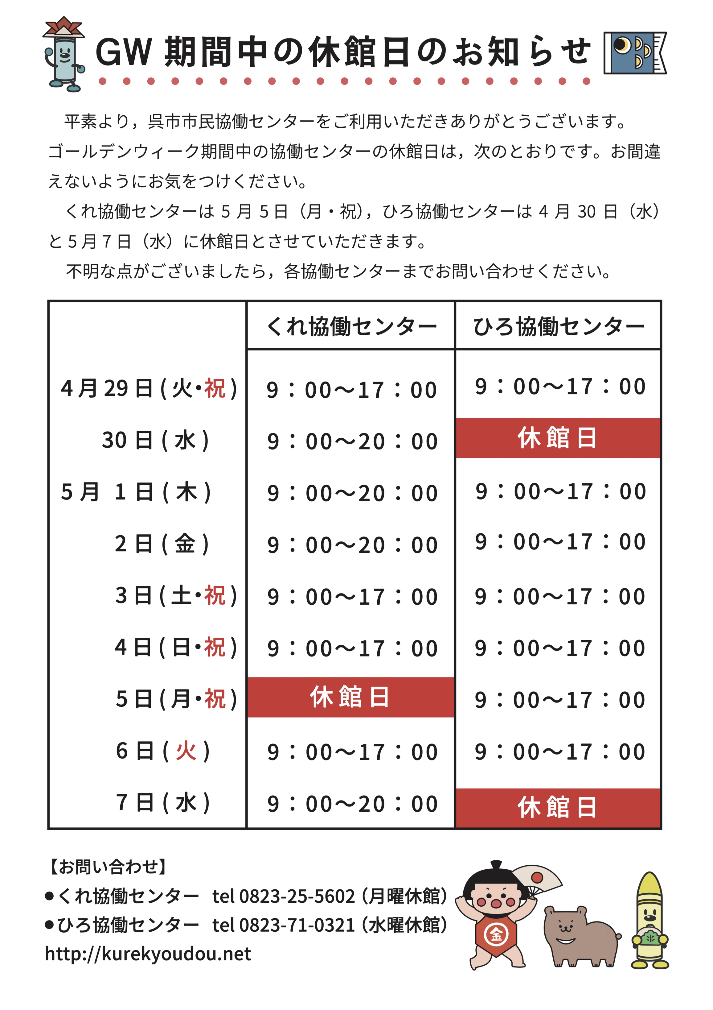 くれ協働センターは5月5日(月・祝)、ひろ協働センターは4月30日(水)