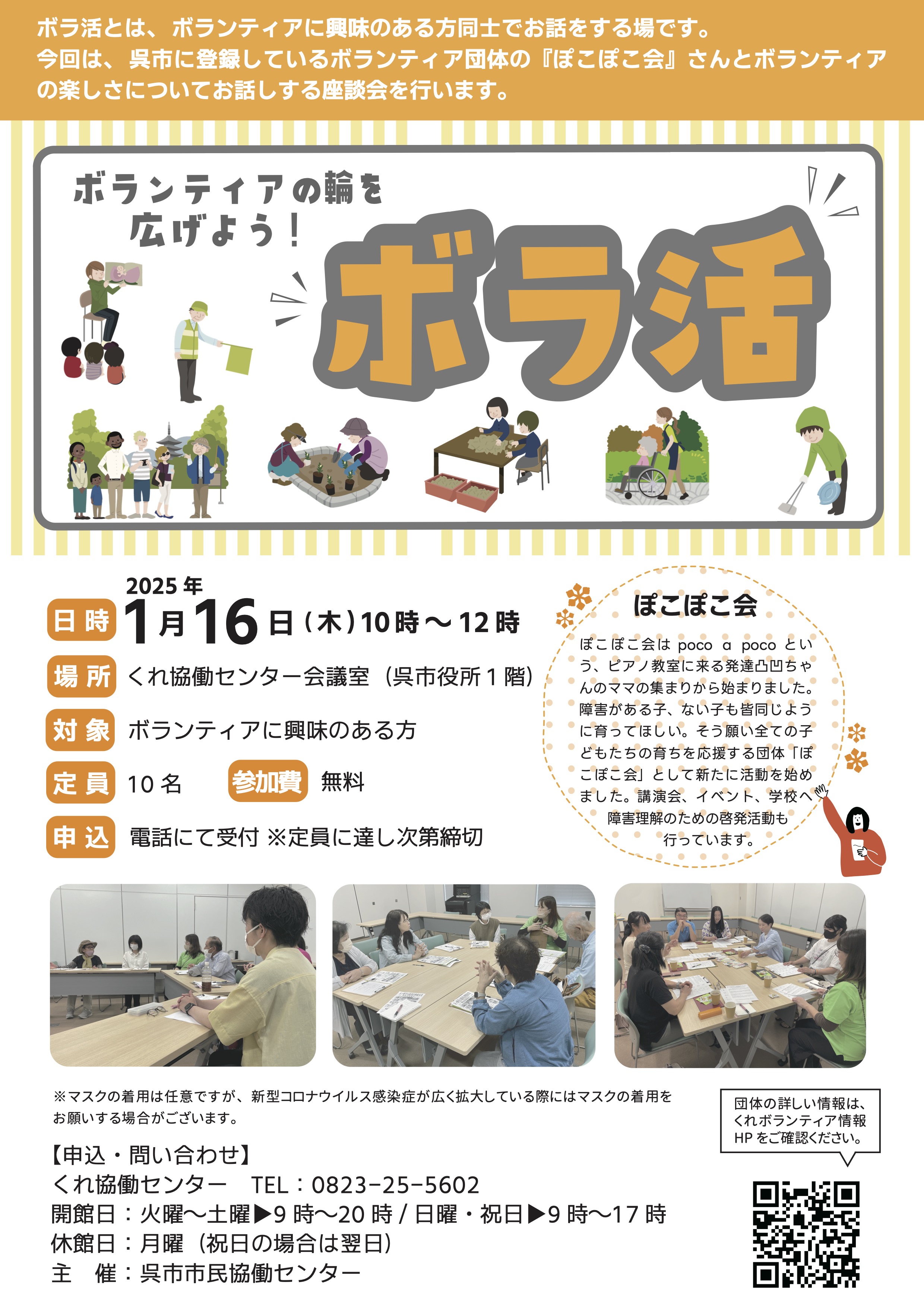 今回は、呉市に登録しているボランティア団体の「ぽこぽこ会」さんとボランティアの楽しさについてお話しする座談会を行います。