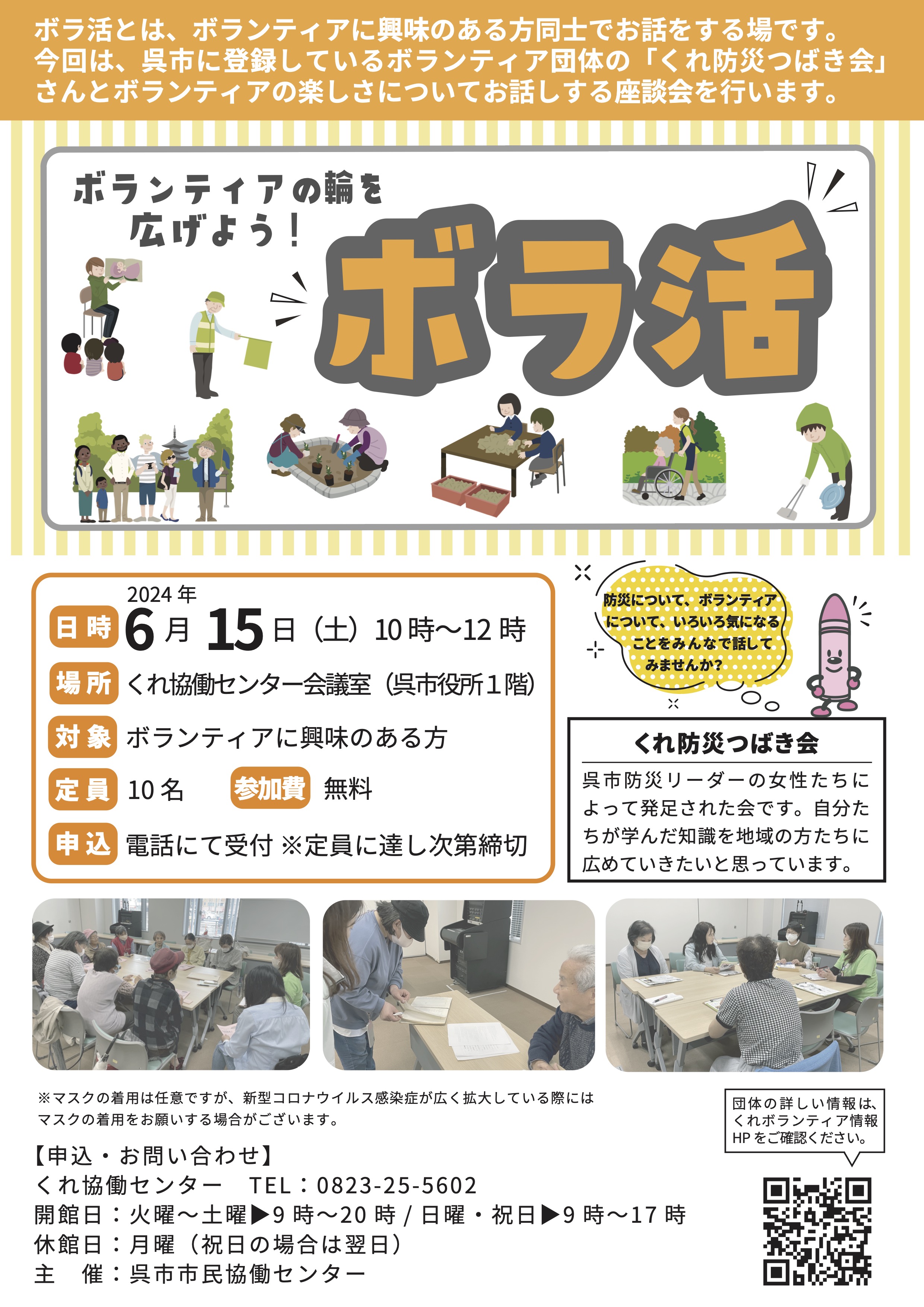 今回は、呉市に登録しているボランティア団体「くれ防災つばき会」さんとボランティアの楽しさについてお話しする座談会を行います。
