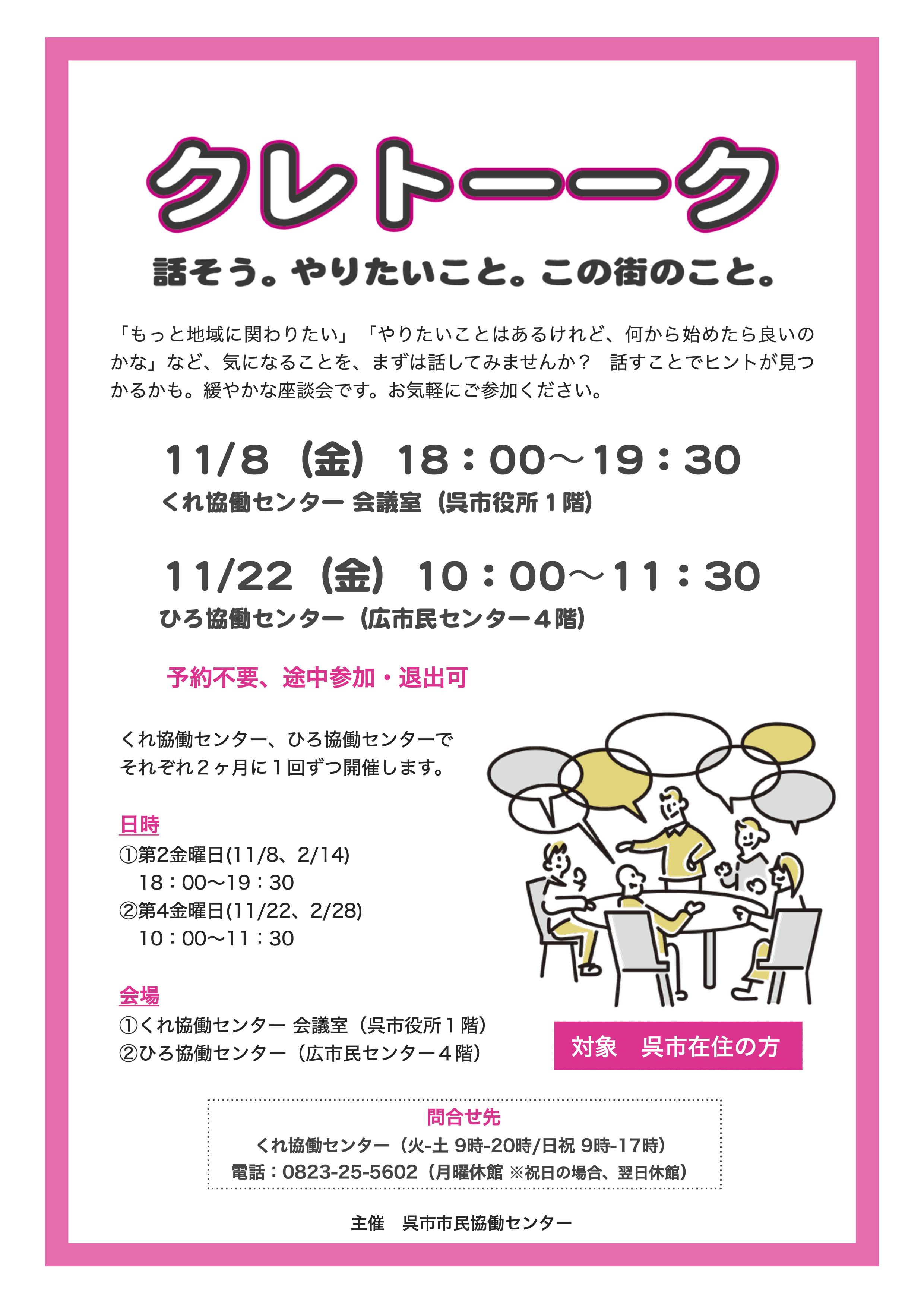 問合せ:くれ協働センター(火-土9時-20時/日祝9時-17時)